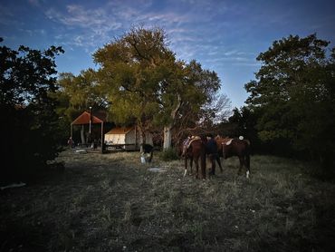 Situated in the top corner of the Texas Hill Country, Bluff Dale is a beautiful backdrop for The Double Horn Ranch. The ranch is nestled amongst sprawling acres of oaks and grassland intertwined with tracts of trails. The guest log cabins are authentic 1800s structures found across the country, disassembled, and reassembled at the ranch. The General Store offers a wide variety of tack and apparel, much of which we have for sale within our online store. In the evenings during overnight clinics you are sure to find music playing and friends sitting around at the Cookshack where dinners are served. The training facility includes three round-pens and a large covered arena. A world-class obstacle course awaits in a lower pasture along the Paluxy river. The more rugged section of the ranch is outfitted with a remote camp accessible by horseback that is sure to take you back in time.